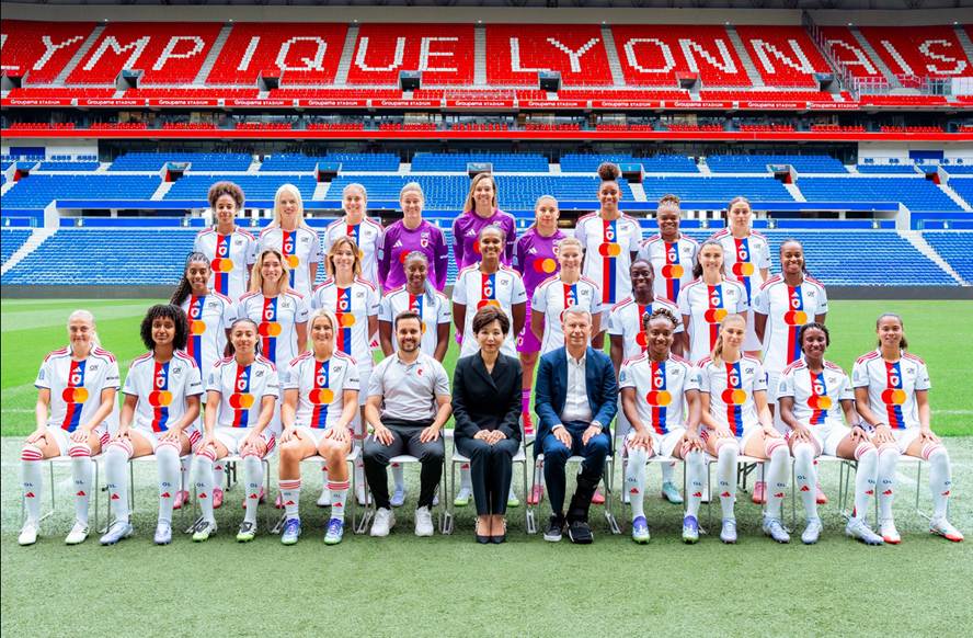 Photo officielle de l’OL féminin saison 2025-26 avec la présidente Michele Kang, l’entraîneur Jonatan Giráldez et Vincent Ponsot