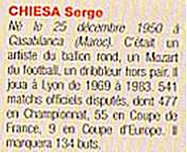 Serge Chiesa détient le record du nombre de matchs joués sous le maillot de l’Olympique Lyonnais avec 542 capes obtenues pendant ses 14 saisons au club, entre 1969 et 1983. Pendant longtemps, les chiffres officiels lui en retiraient un (cf 2 exemples). Mais nos recherches (voir explications notamment dans la page suivante, en cliquant sur documents à l'appui en dessous) et notre action ont permis de rétablir la vérité. |